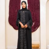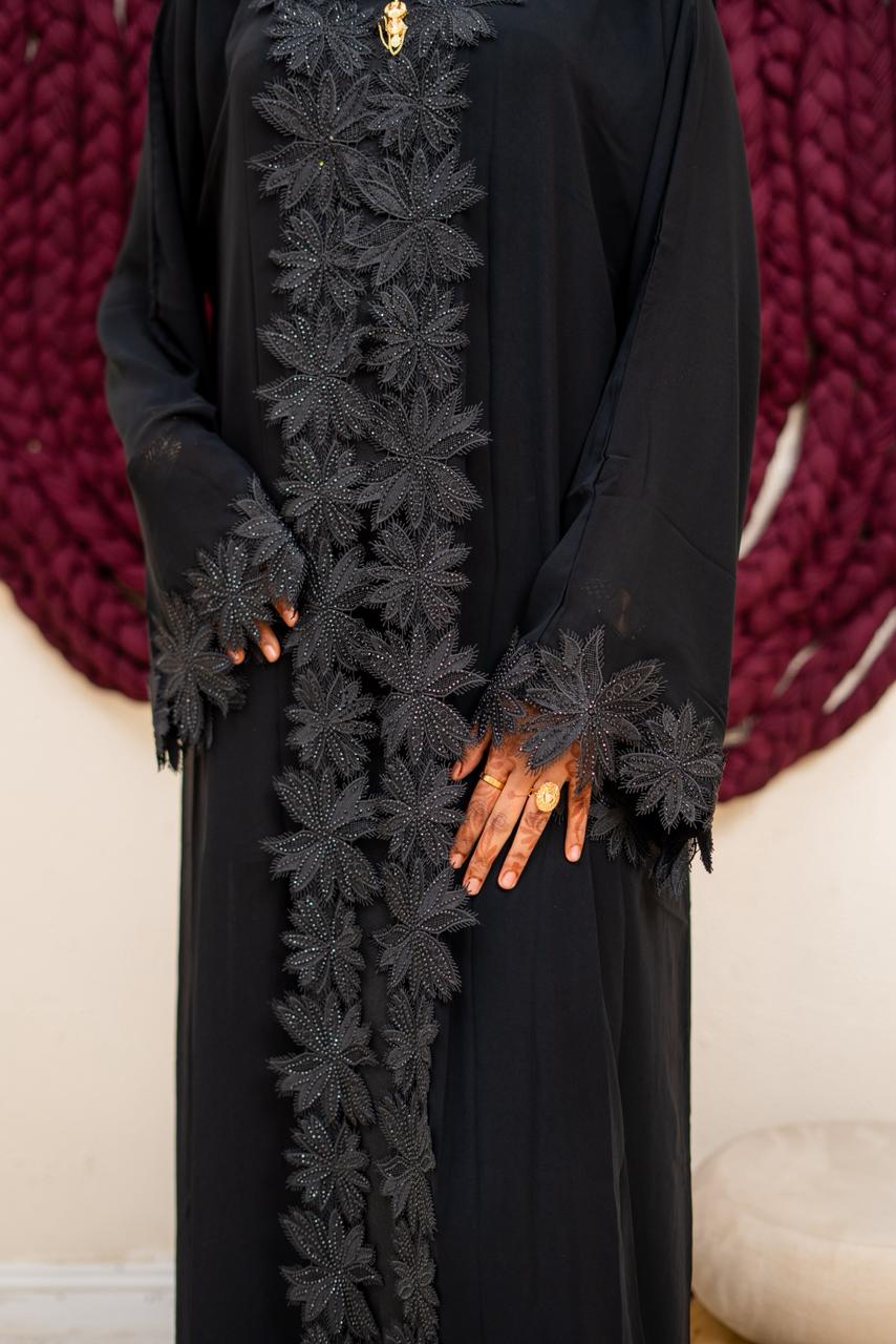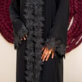 The standout feature of the Haya Abaya is its stunning floral lace appliqué that cascades vertically down the front, creating a bold yet elegant focal point. The sleeves are finished with matching lace detailing at the cuffs, adding balance and refinement to the overall design. Subtle embellishments within the lace catch the light gently, giving the abaya a luxurious touch without overwhelming its classic black aesthetic.